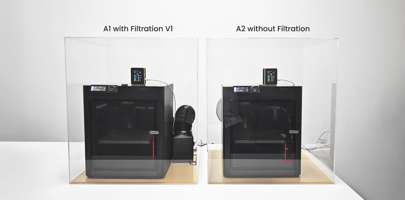 The test was conducted using two Bambu P1S 3D printers, each placed inside a sealed enclosure with 60 × 60 × 70 cm.