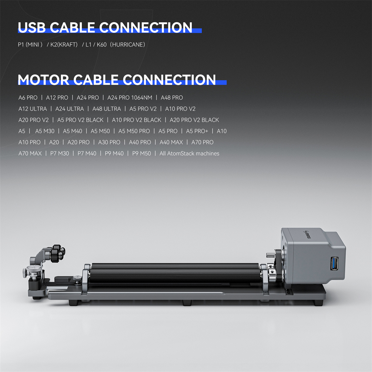 2. Intelligent recognition with a built-in recognition chip. Once connected to the machine, it automatically switches to roller mode and seamlessly integrates with the ATOMSTACK STUDIO software, eliminating the need for manual parameter configuration.