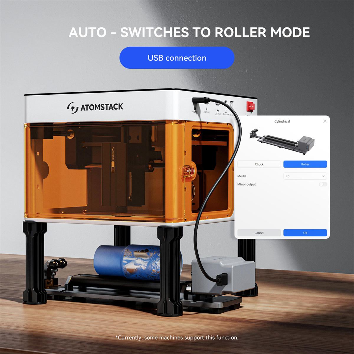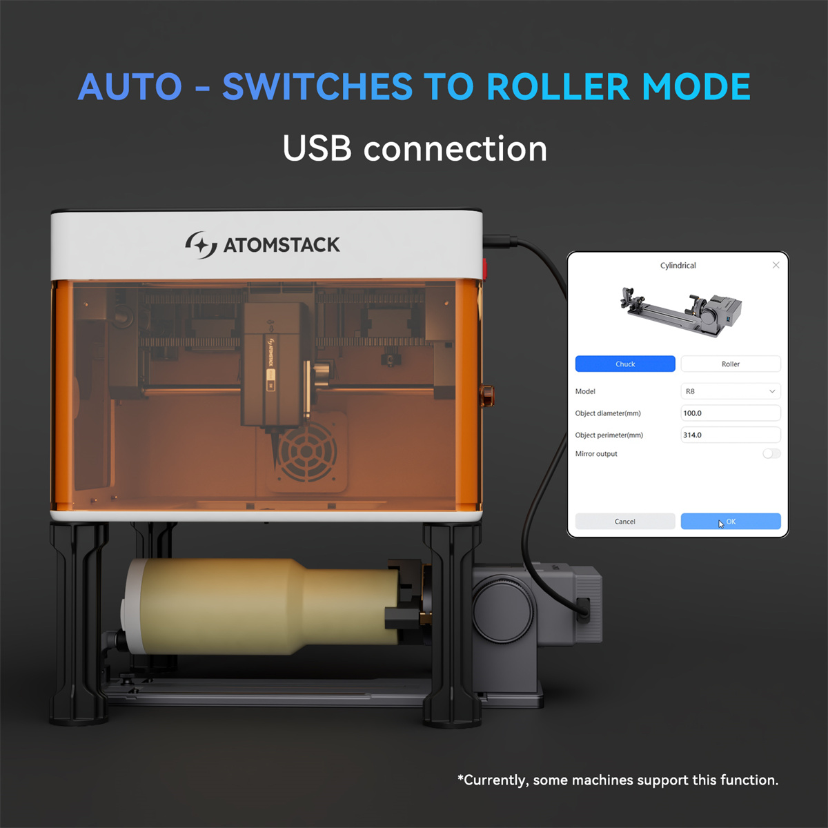 2. Intelligent recognition with a built-in recognition chip. The machine automatically enters roller mode and seamlessly integrates with ATOMSTACK STUDIO software, eliminating the need for manual parameter settings.