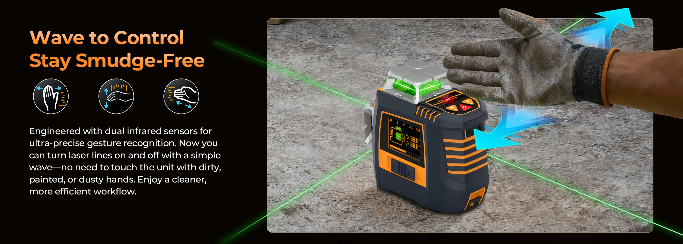 1. Contrôle révolutionnaire sans les mains (activé par gestes) : dispose d’une opération sans contact améliorée avec de simples mouvements de la main (contrôle gestuel) pour changer les modes de ligne laser, ajuster la luminosité ou activer le mode stroboscopique. Cela résout le problème critique des mains occupées sur site, offrant une commodité sans précédent et améliorant l’efficacité du flux de travail.