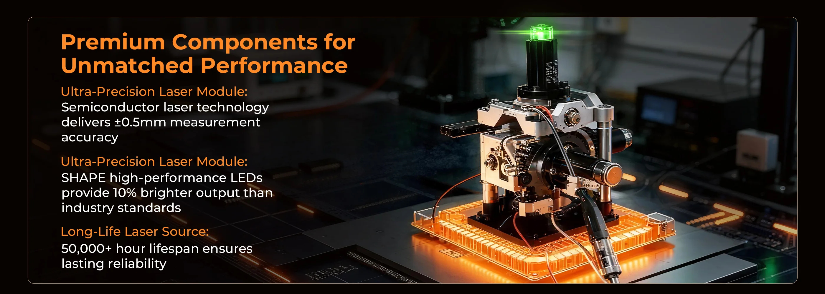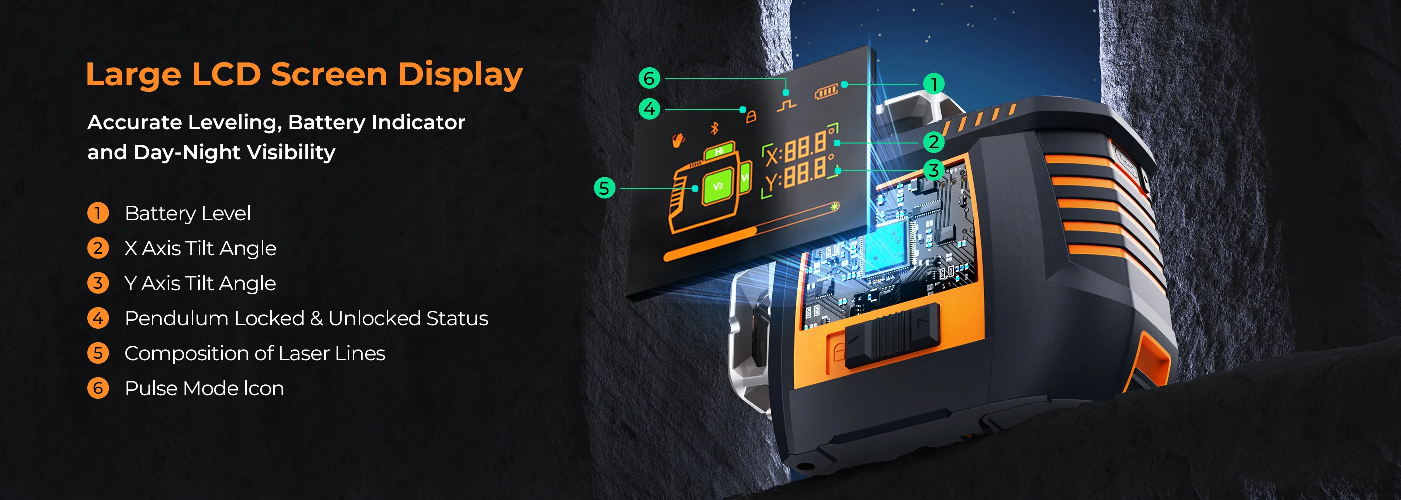 3. Affichage numérique latéral pour une précision en temps réel : Le grand affichage numérique monté sur le côté fournit un retour d’information instantané et clair sur les métriques cruciales, y compris les angles des axes X/Y en temps réel, les modes de ligne actuels, l’état de la batterie et les niveaux de luminosité. Les informations essentielles sont visibles d’un coup d’œil, améliorant considérablement la précision de l’alignement.
