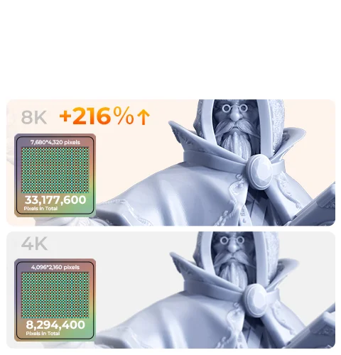 8K mono LCD brags 33,177,600 pixels and 29.7μm XY resolution, a huge leap from the 50μm of regular 4K. Hair, fabric, skin textures, and organic shapes all come to life.