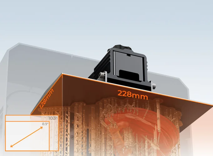 HALOT-MAGE features a large LCD screen for a 228x128x230mm build volume, about 45% larger than an 8.9″ printer. Now, more can be done at will to amplify the joy. Just work magic in a bigger way.