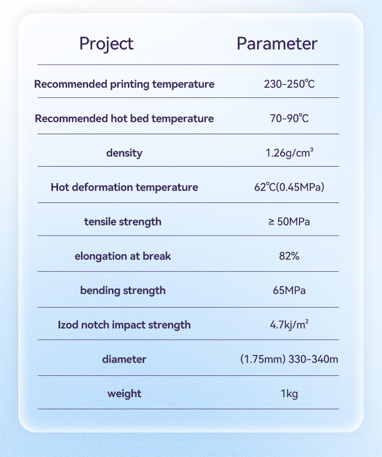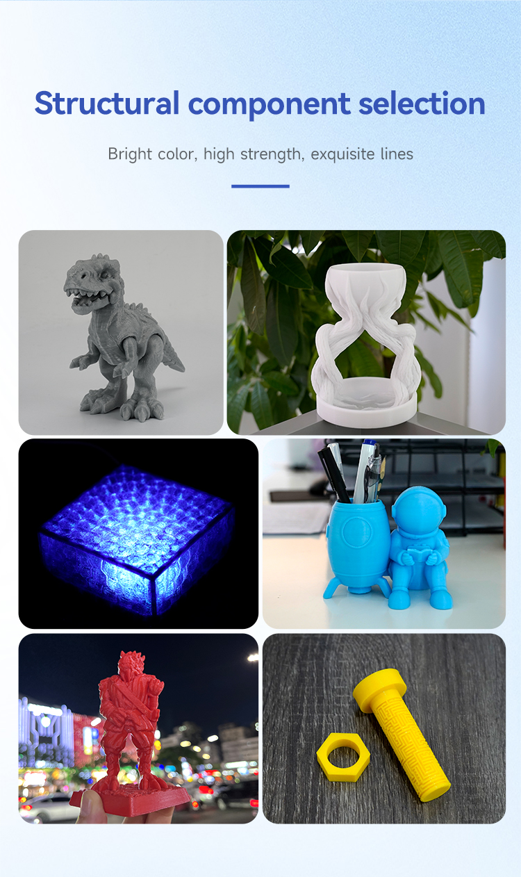 5. Adaptabilité avec des utilisations polyvalentes : combine les avantages de l’ABS pour sa résistance et du PLA pour sa facilité d’utilisation, le rendant adapté aux prototypes, aux décorations et aux pièces mécaniques.