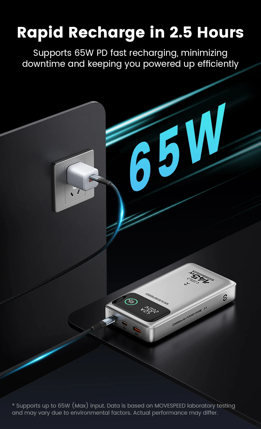5. Recharge rapide : prend en charge l’entrée rapide de 65W PD pour recharger complètement la batterie externe en seulement 2,5 heures.