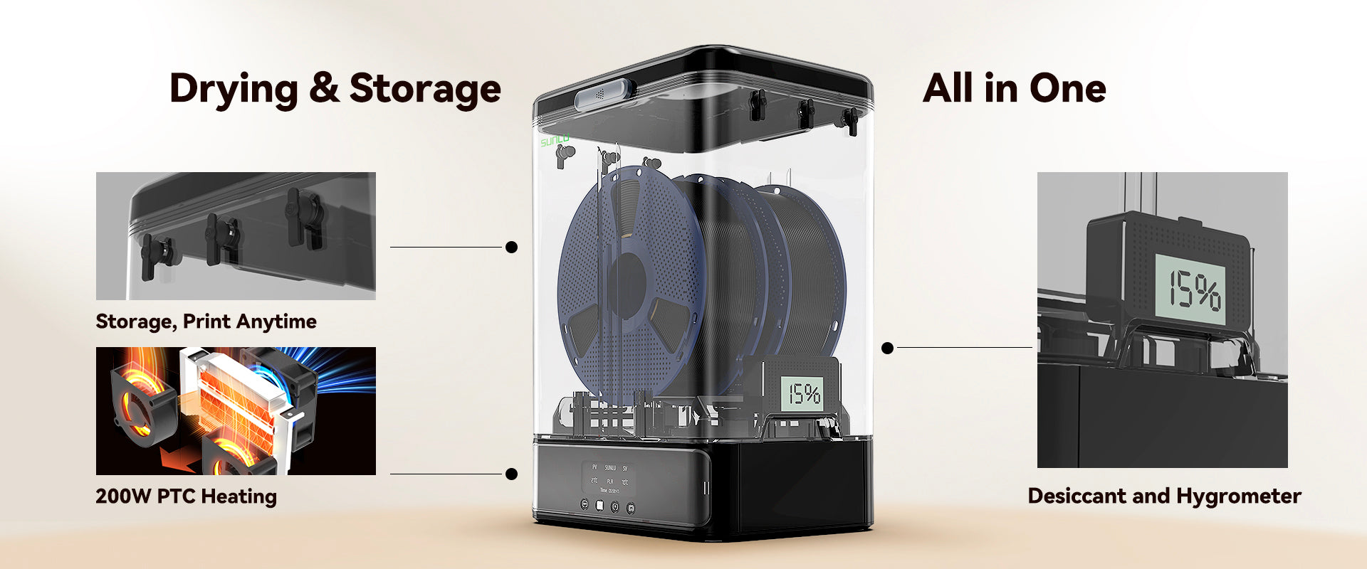 [2-in-1 Filament Dryer and Storage Box Combination] Is there any way to handle drying and storage filament at the same time? SUNLU FilaDryer SP2, with efficient heating base and storage box, designed as two separated parts. Multiple storage boxes can be used as storage boxes can be freely stacked (maximum stacking of 3 is recommended) to enhance space utilization.